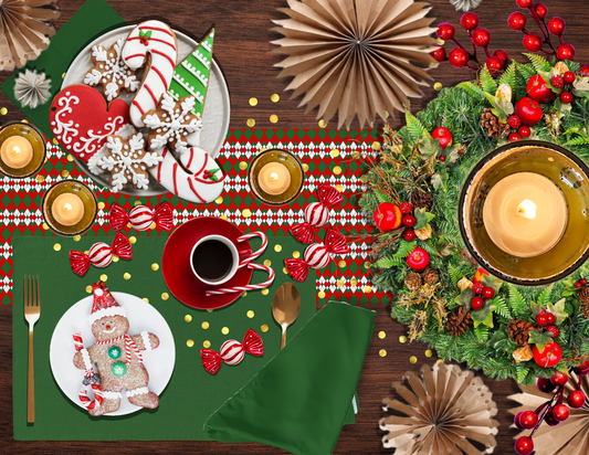 Fancy Red Green & White Argyle Christmas Table Runner | Festive Holiday Dining Décor, Rustic Farmhouse Diamond Check