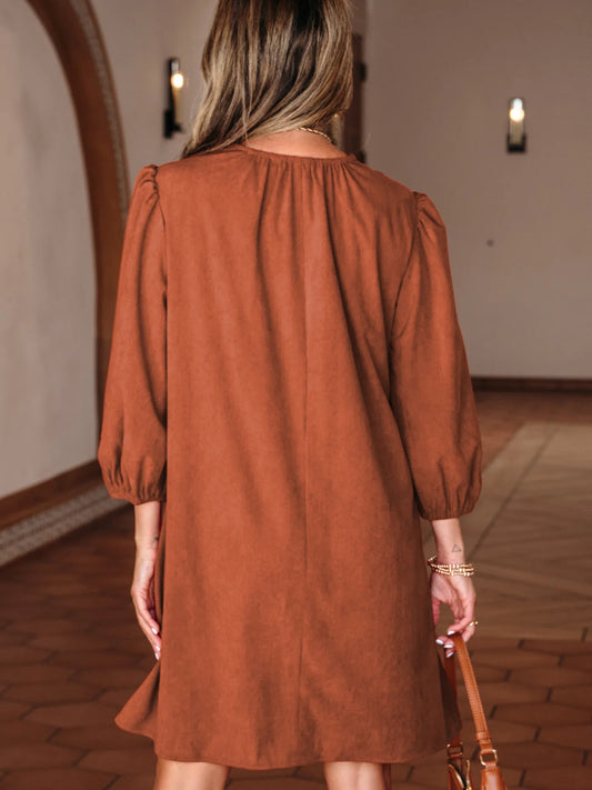 Corduroy Half Button Collared Long Sleeve Mini Dress