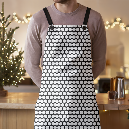 White Polka Dot on Black Holiday Apron | Lightweight 100% Polyester Twill, Detachable Black Twill Straps