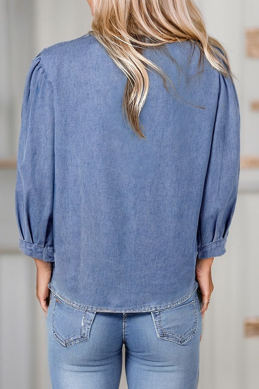 Solid Metallic V-Neck Puff Sleeve Babydoll Blouse