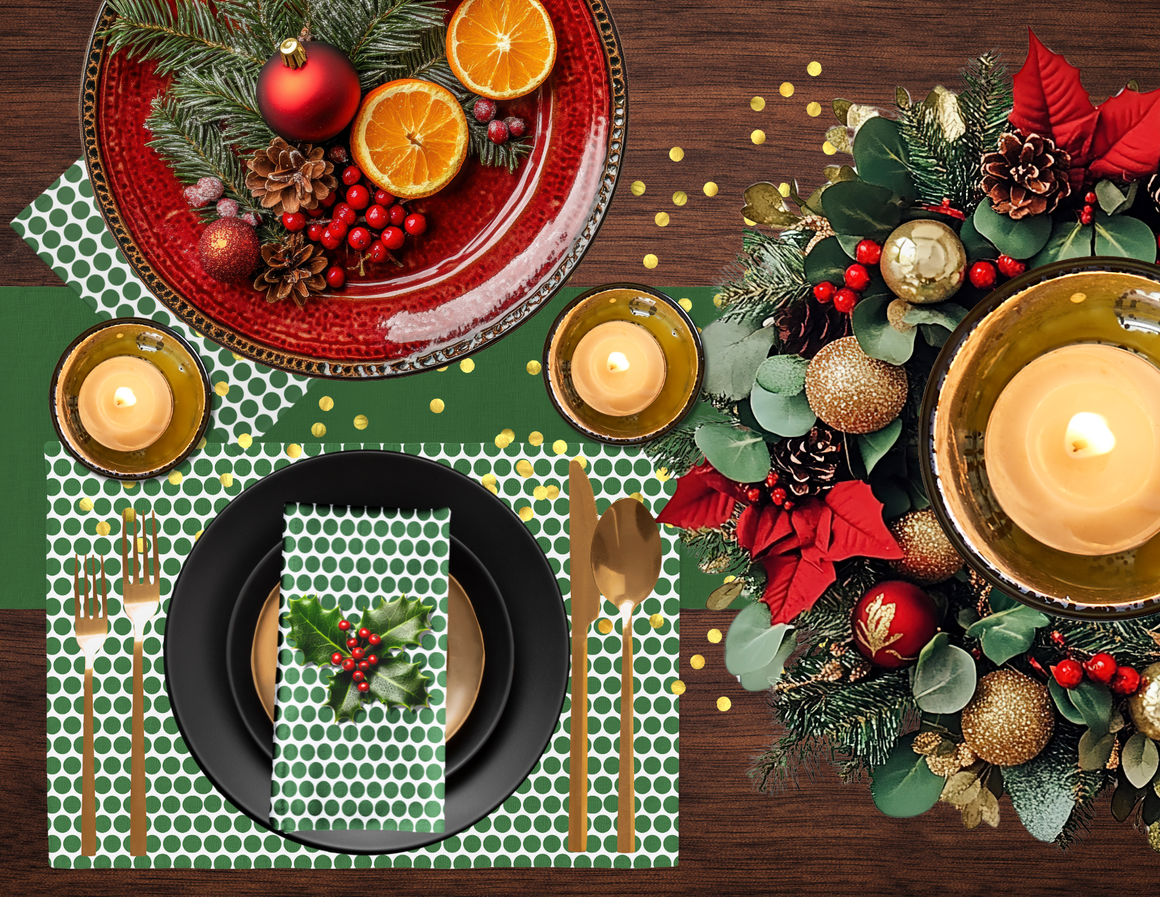 Add a punch of color to your holiday table with these Green Polka Dot Polyester Napkins. Festive, fresh, and endlessly reusable, they’re perfect for holiday meals that deserve a playful pop. Pair with the Green Polka Dot table runner for a set that slays.