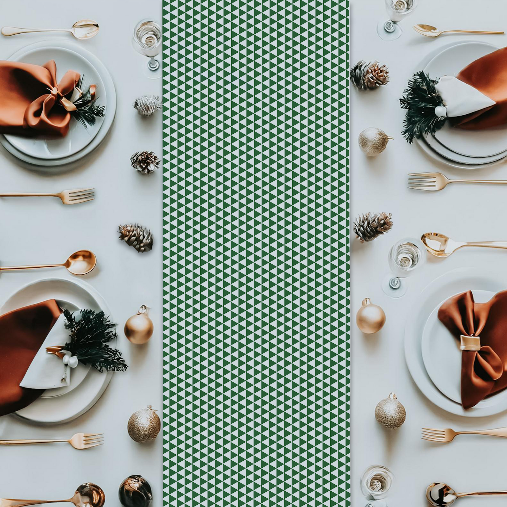 The crisp green-and-white triangle pattern is a playful nod to modern holiday style, while still pairing effortlessly with traditional reds, golds, and greenery. Perfect for family feasts, holiday parties, or even as an everyday December upgrade, this runner instantly transforms your table from “nice” to “nailed it.”