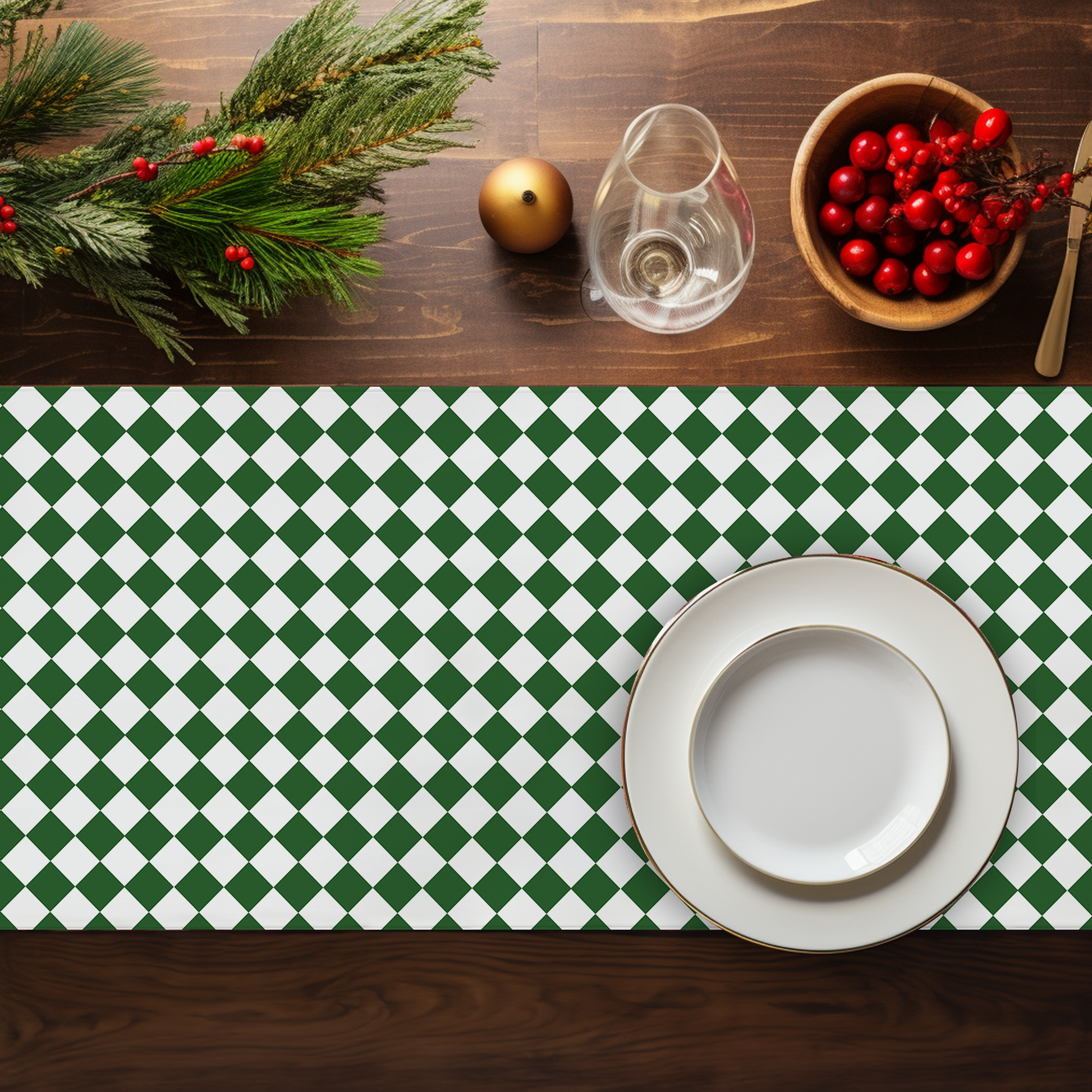 Green & White Argyle Christmas Table Runner | Classic Holiday Farmhouse Dining Room Decor, Festive Diamond Check Table Accent