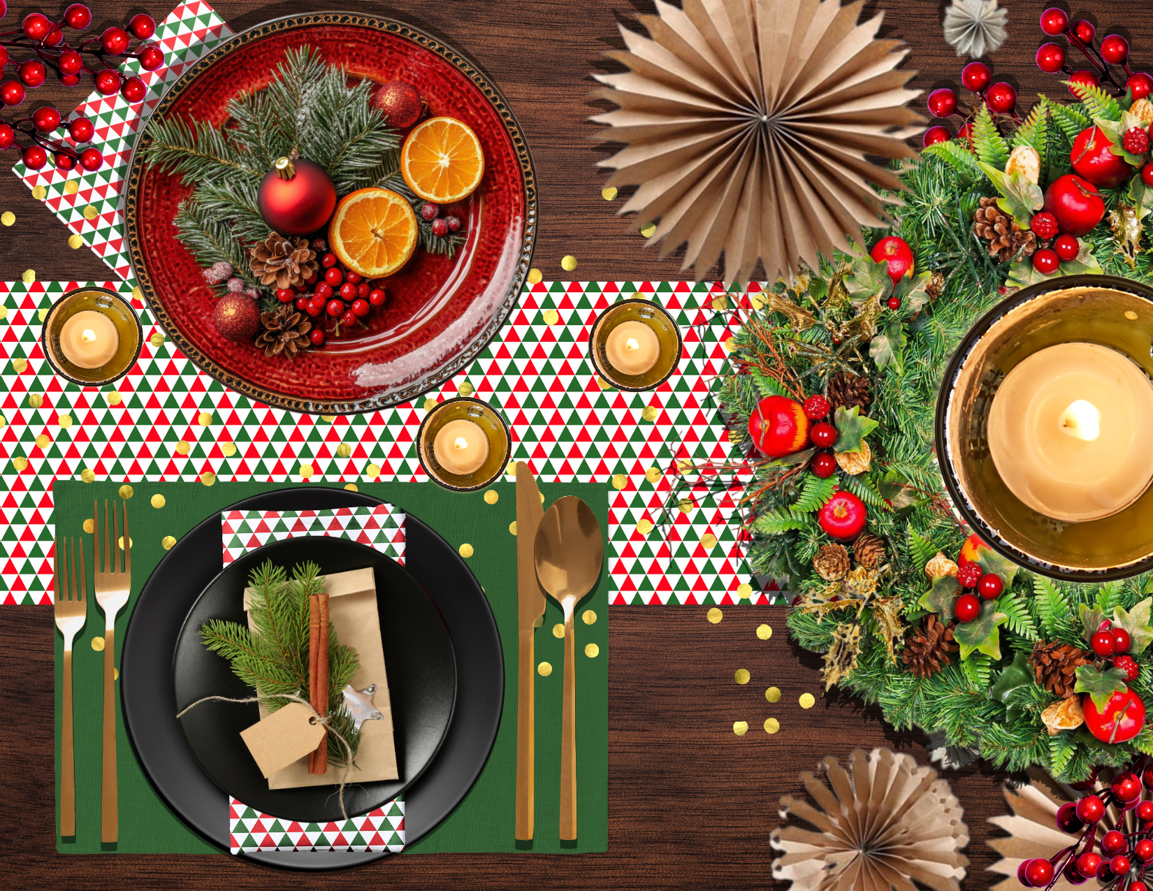 Bold triangles, bright colors—holiday table, leveled up.