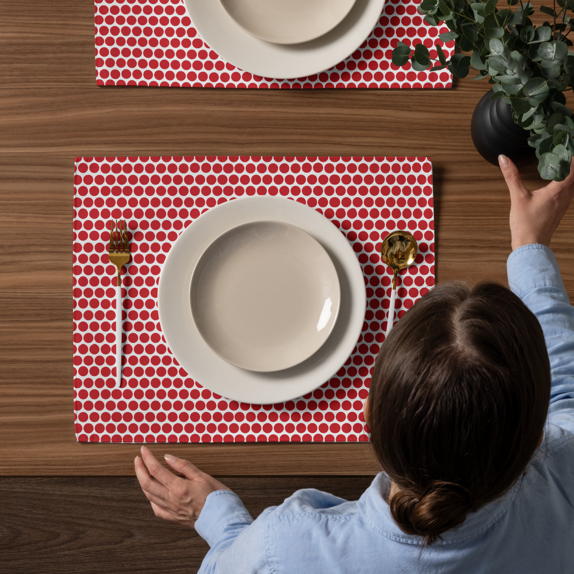 Turn your holiday meals into a celebration with Red Polka Dot Polyester Placemats. Bold, bright, and playful, these spots bring a cheeky holiday vibe to every table. Designed to match our table runners + napkins for a coordinated set.