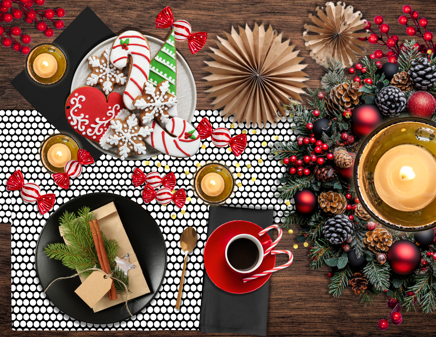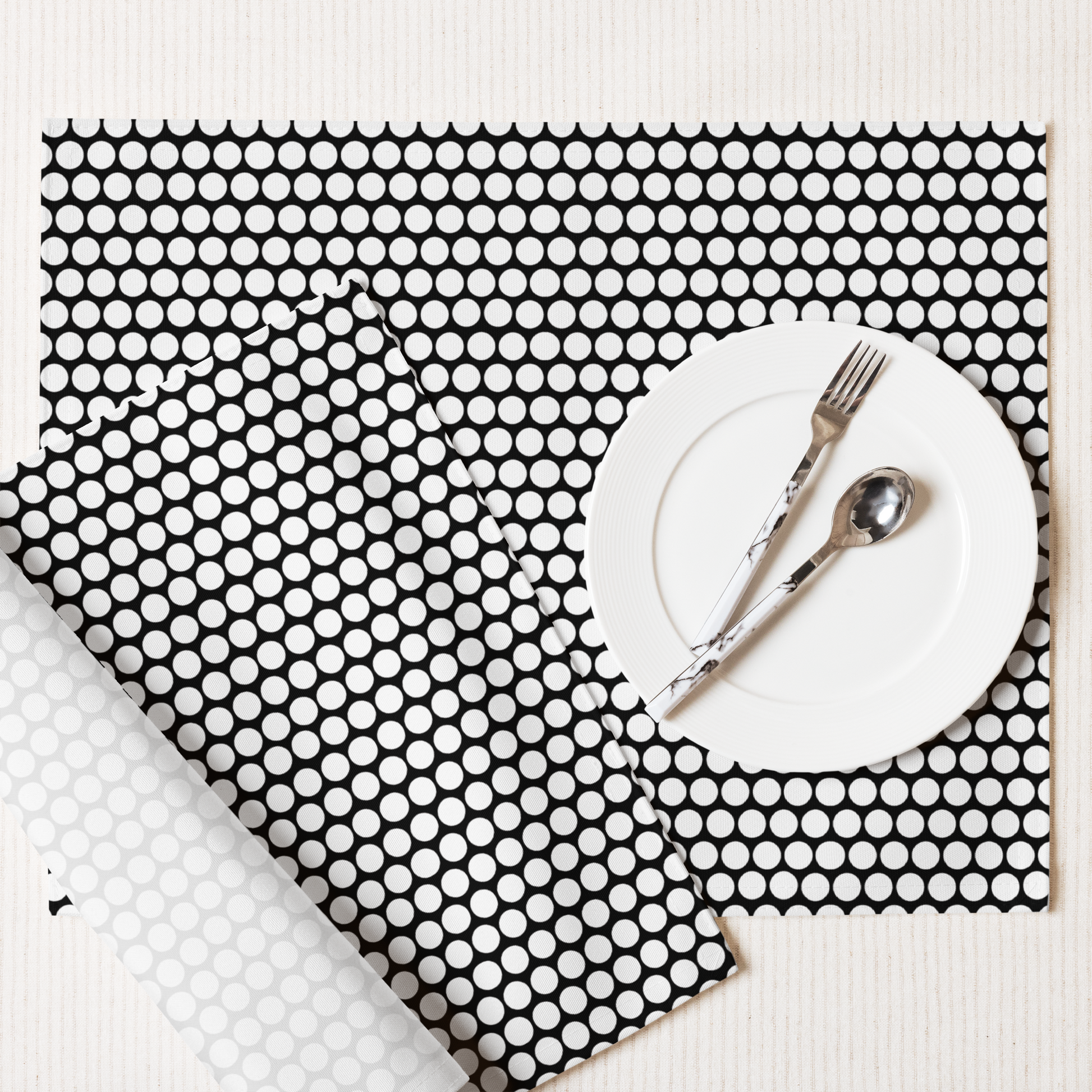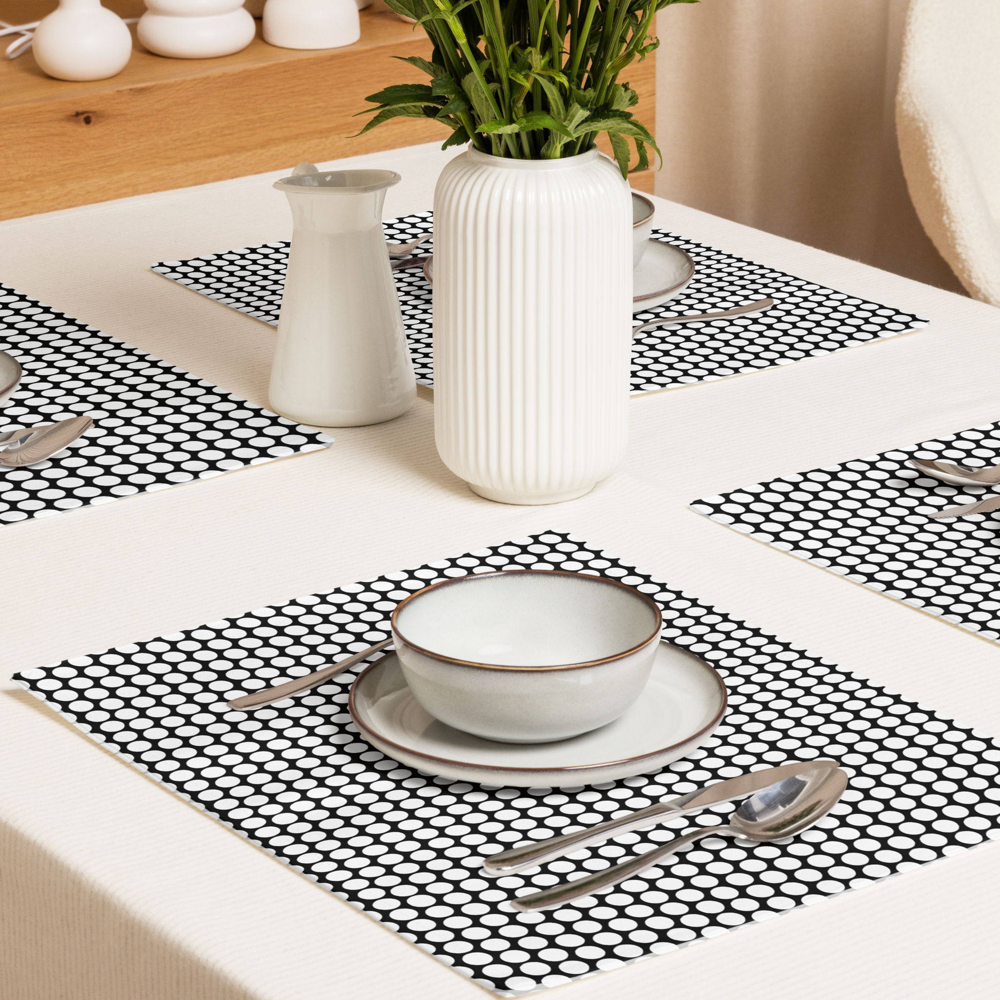 Bold black, bright dots—placemats with holiday punch.