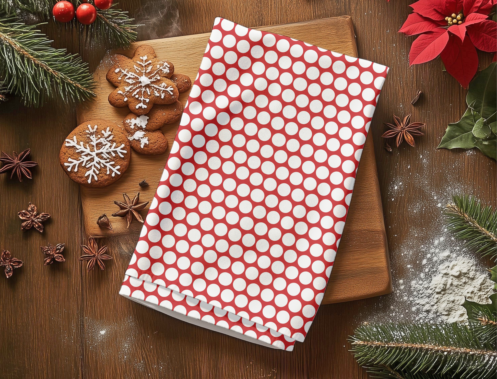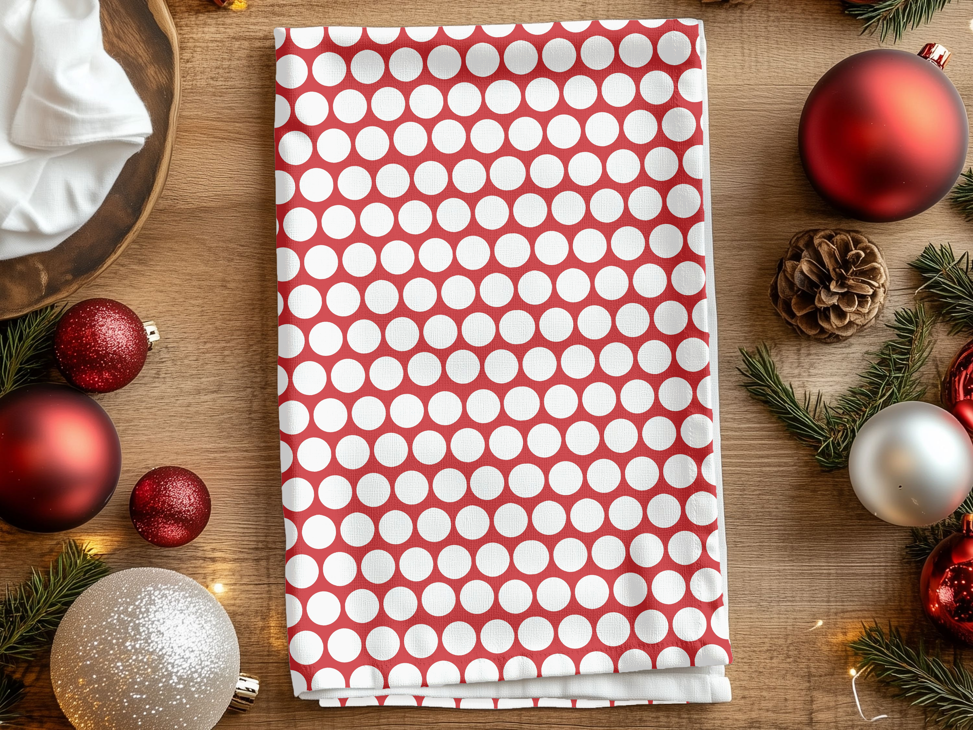 ❤️🎁 Red Hot Dots. White spots on red that shout holiday spirit with zero effort. Made with a polyester front that’s the perfect printing canvas and a soft cotton back that loves your hands, this towel is as chic as it is useful. Perfect for kitchens, powder rooms, or holiday hostess gifts, it brings festive flair and functional charm to any space—merry in December, stylish all year long. ]